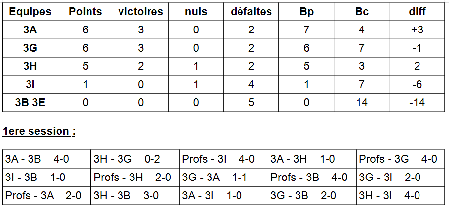 Les 3A gagnent le tournoi grâce à une différence de but favorable (devant les 3G qui toucheront la coupe du bout des doigts :) ) et remettrons en titre le titre à la prochaine édition prévu mi-janvier.